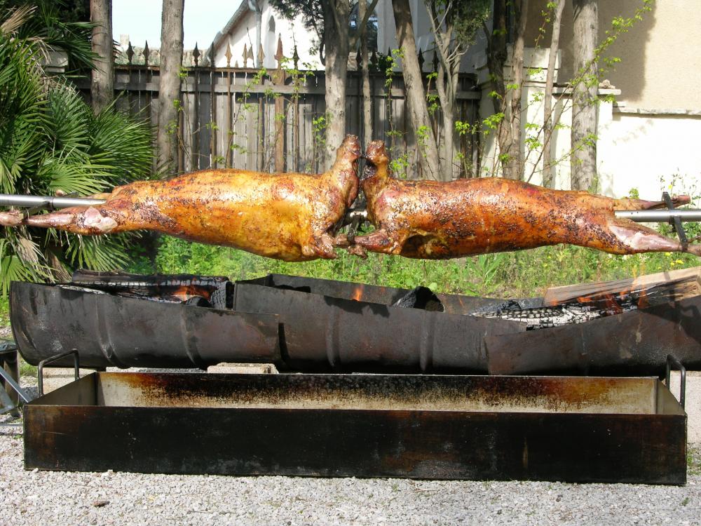 Agneau à la broche (option label rouge), Porcelet à la broche, Magret de canard.